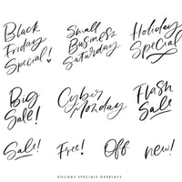 - 10 Holiday Promo Overlays including: Big Sale, Black Friday Special, Cyber Monday, Free, Small business Saturday, Holiday Special, Flash Sale, Sale, Free, Off, New.